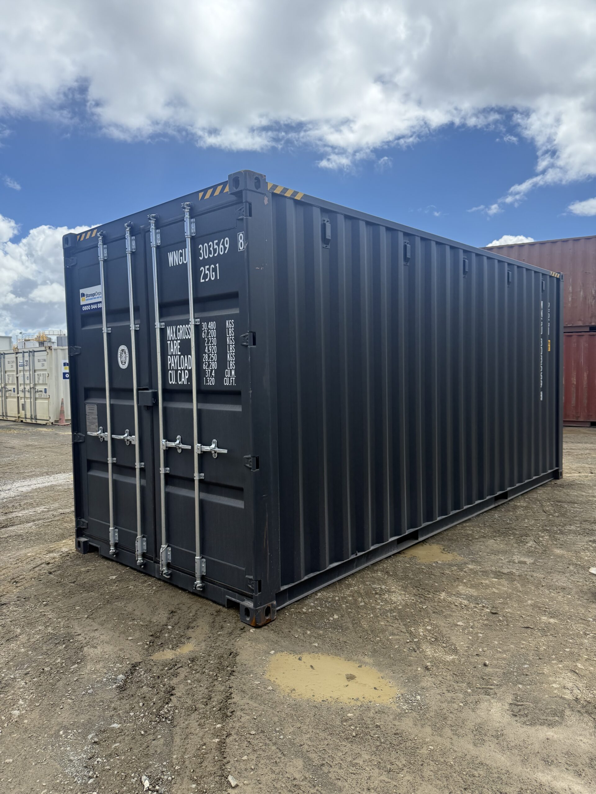 Our 20ft high cube new build containers arrive in New Zealand as one-trip units, shipped directly from the factory. While they may carry light scuffs or minor dents from transport, every container is structurally sound and certified for five years from manufacture.